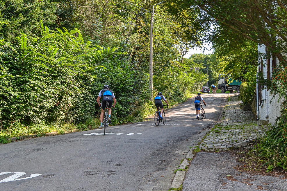 Dan volgt de grootste horde van de etappe: de Muur van Hoei. Dit lastpak (0,9 km, 12,4% gemiddeld!) staat in het routeboek als segment gemarkeerd, met een bolletjesprijs voor de snelsten per groep.