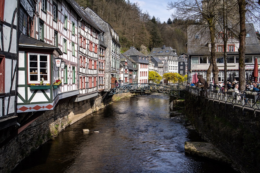 Bij de dorpen Küchelscheid en Kalterherberg keren we terug in de bewoonde wereld. Willkommen in Deutschland! Het is algemeen bekend dat de taart in Duitsland doorgaans een klasse beter is dan bij ons, dus we knijpen in de remmen voor een extra koffiestop in Monschau. Op het terras aan de markt, verwennen we onszelf met een ‘Tasse Kaffee’ en ‘Apfelstrudel’.