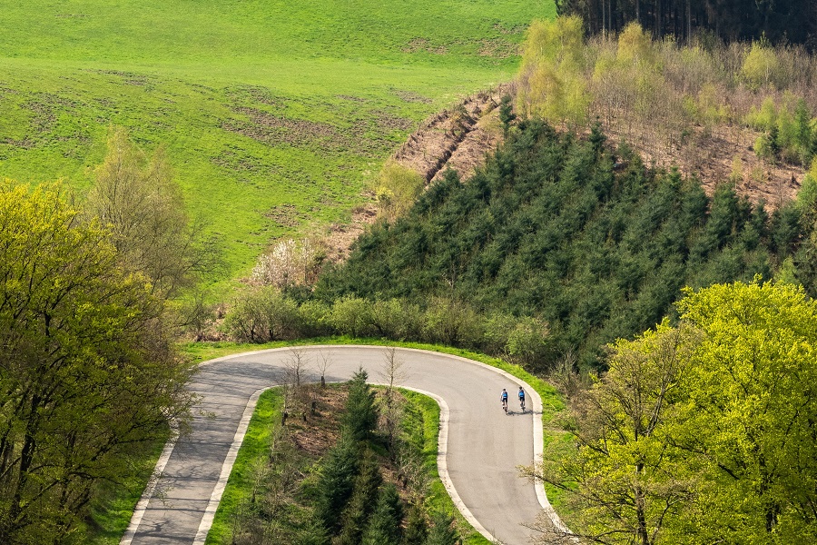 De klim vanuit het vakwerkstadje richting de Belgische grens, rijden we rustig op om de Apfelstrudel te laten zakken. Eenmaal boven laten we de doorgaande weg die bekendstaat als de ‘Highway to Hell’ links liggen en steken nog eens door het natuurreservaat van de Hoge Venen. Het asfalt van de geleidelijk aflopende bosweg is soms van slechte kwaliteit, maar de omgeving met zijn uitgestrekte bossen en kletterende watervallen compenseren rijkelijk. Net als de passage over de imposante Wesertalsperre stuwdam langs het Meer van Eupen.