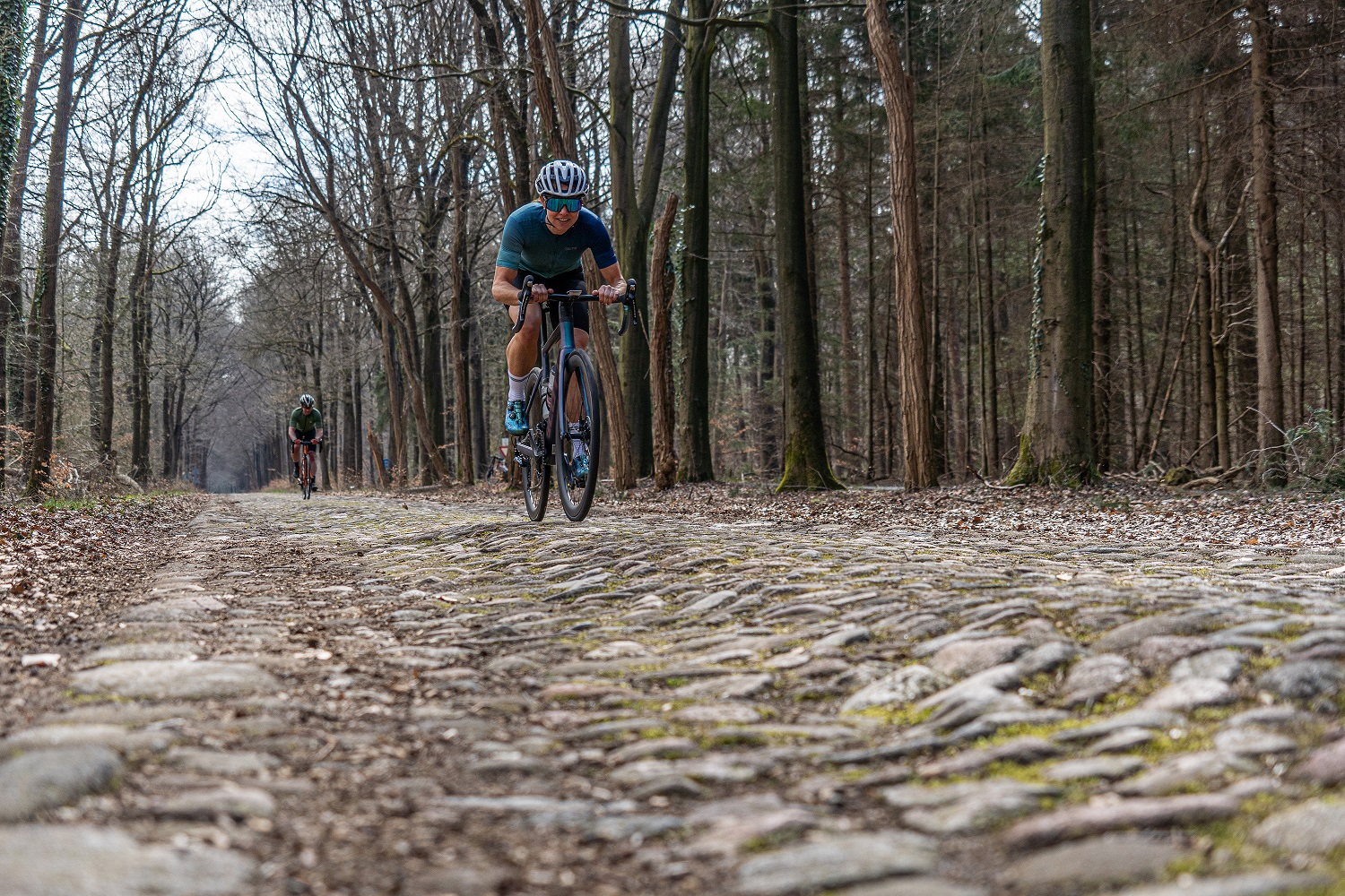 De keien liggen nog schever dan de gemiddelde kasseienstrook, maar vanwege hun kleine formaat dokker je er wel soepeler overheen. Ik stuur naar de rug van de strook, die bedekt is met mos. Listig bij vochtig weer! Als je de keien maar niets vindt, kun je overigens ook het naastgelegen fietspad kiezen.