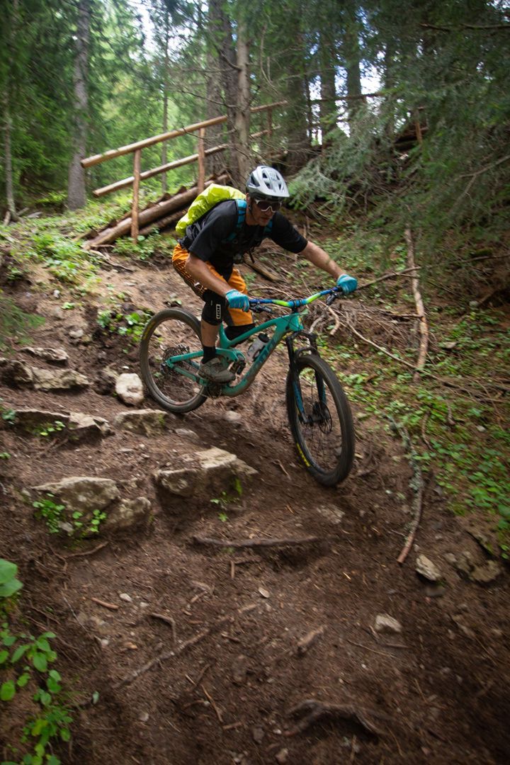 Op de terugweg richting Canazei neemt Werner ons mee naar de Titans trail, wederom een EWS-route, met een lift die alleen onder begeleiding van een mountainbike-guide genomen mag worden. Het is dan ook een gnarly trail: wortels, stenen en een behoorlijke hellingsgraad vormen een aaneenschakeling van technische uitdagingen.