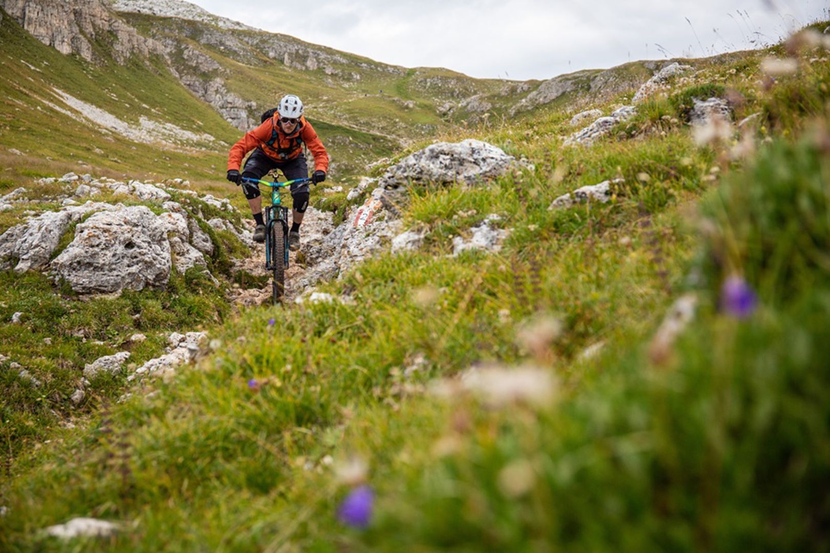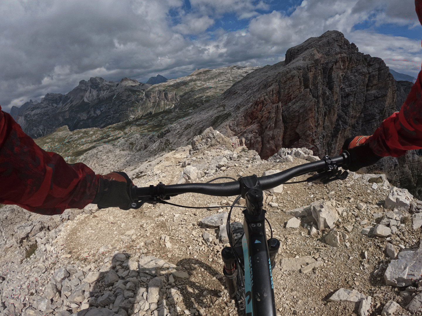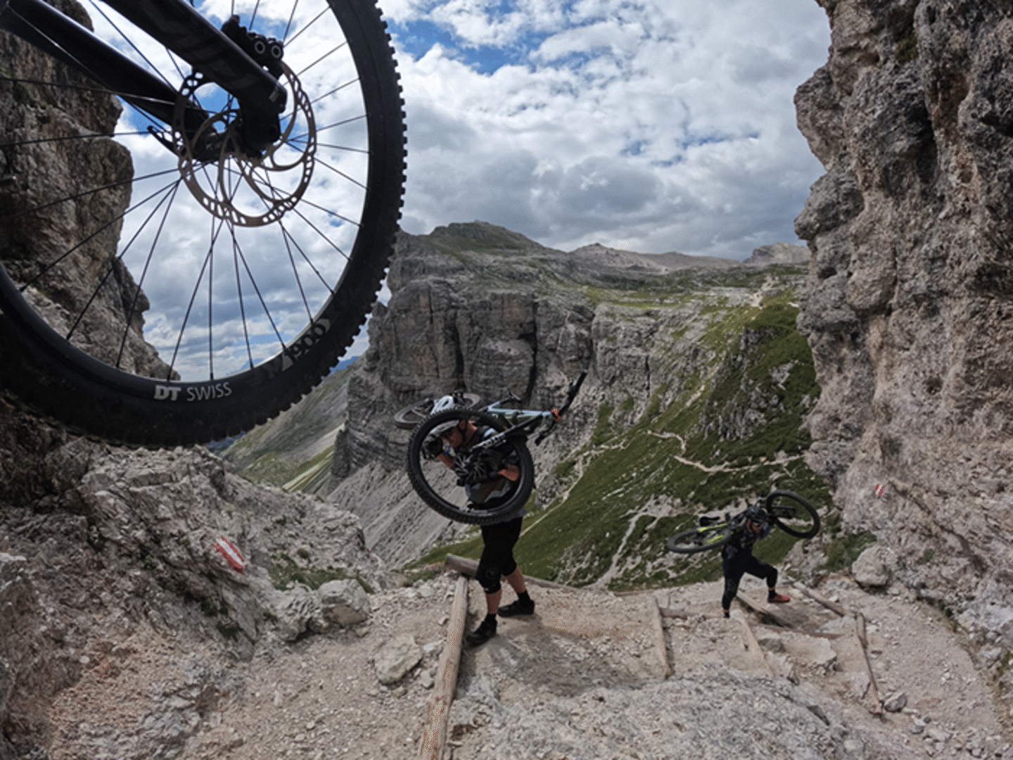 Door dit extreme terrein zijn de Dolomieten niet de meest voor de hand liggende mountainbikebestemming van Europa. Je moet er niet raar opkijken als een pad overgaat in een Via Ferrata (klettersteig), of als een wandelroute pal langs een afgrond loopt. We zijn dus al voorbereid op klauterpartijen en lange hike-a-bikes, maar zouden nog steeds nergens zijn zonder een ervaren lokale gids.