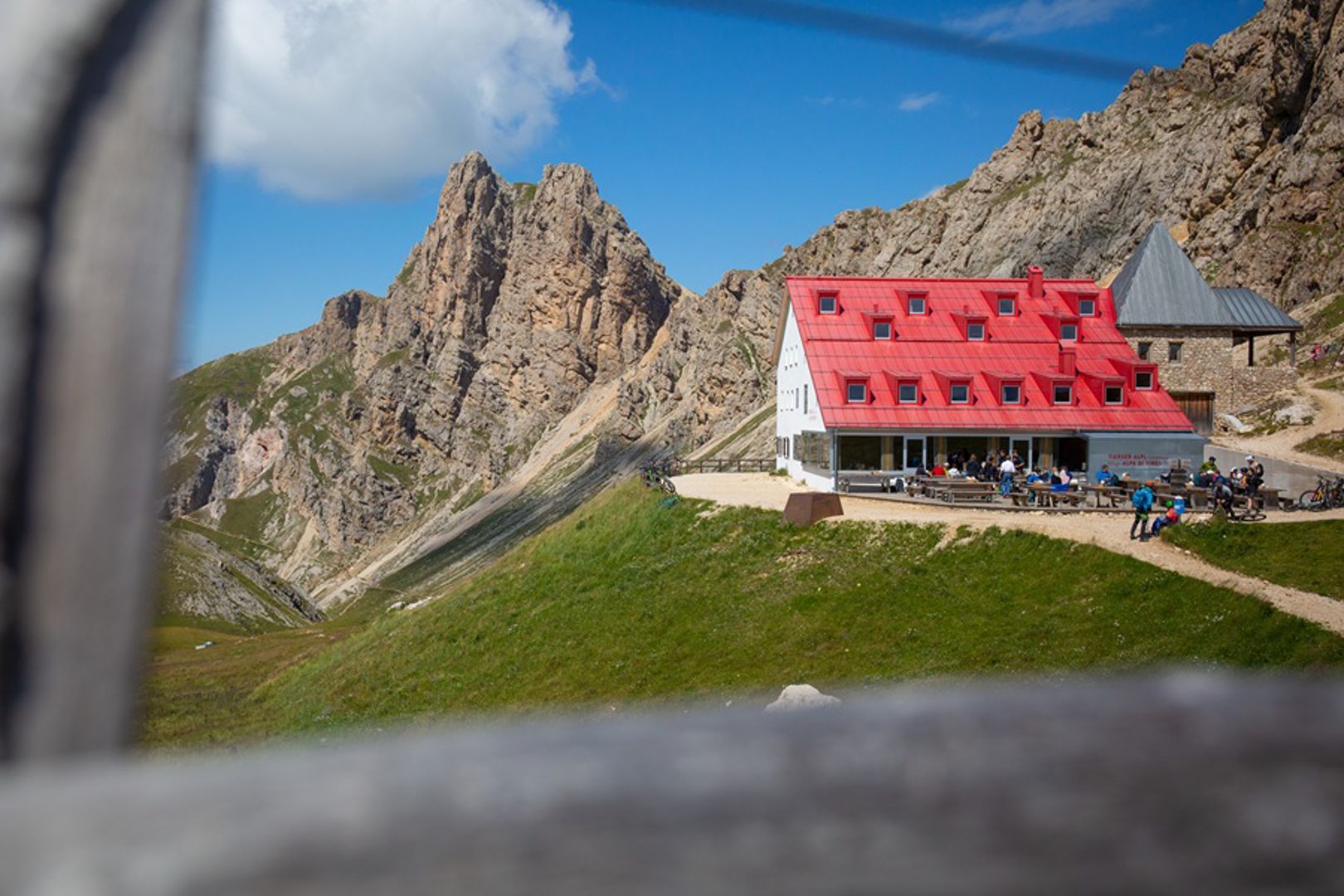 Een stevige traverse die af en toe de fiets op onze schouders dwingt, voert ons langs de top van het Terrarosamassief naar de Rifugio Bolzano. Een grote stenen hut, die er al net zo sprookjesachtig uitziet als zijn omgeving. We genieten van het uitzicht en nuttigen een welverdiende lunch, voordat we het dal induiken.