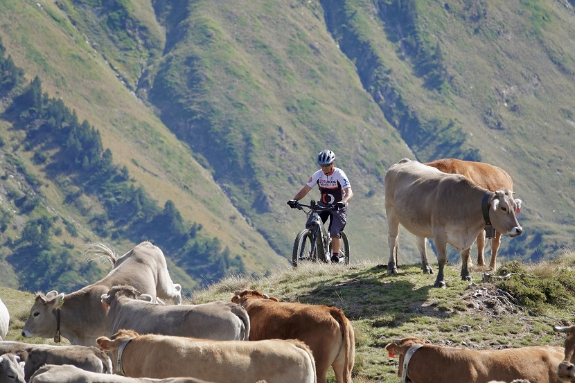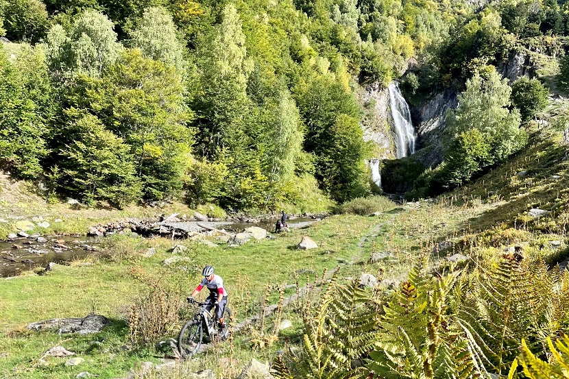 Na een uurtje gestaag trappen maakt asfalt plaats voor gravel. “De route gaat rechtdoor, maar ik wil je iets laten zien: Saut deth Pish. Niet veel later sta ik oog in oog met een waterval die als een witte sluier de grijze rotswand bedekt. Prachtig. Na een verplichte fotostop gaat het verder omhoog. Kilometerslang hobbelen we langs een steile bergflank. Op de top worden we verwelkomd door koeien met vrolijk klinkende bellen. Francisco trekt een windjasje aan en stort zichzelf als een lawine de diepte in. Ik volg zijn voorbeeld en brul het uit van plezier.