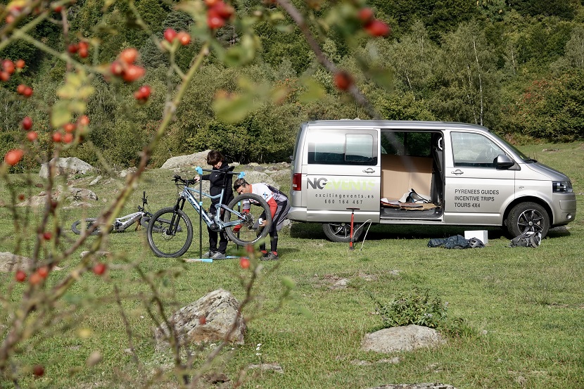 Beneden besluiten we om naar het Baquira-skigebied te fietsen. We stuiven afwisselend over stoffige kiezelwegen, groene skipistes en steile bospaden. Vaak makkelijk, maar soms ook lastig voor een boomlange laaglander die niet vaak in de bergen fietst. Mijn gids lijkt onvermoeibaar. In Refugi Montgarri komen we op krachten met een geweldige streeklunch. Met een
