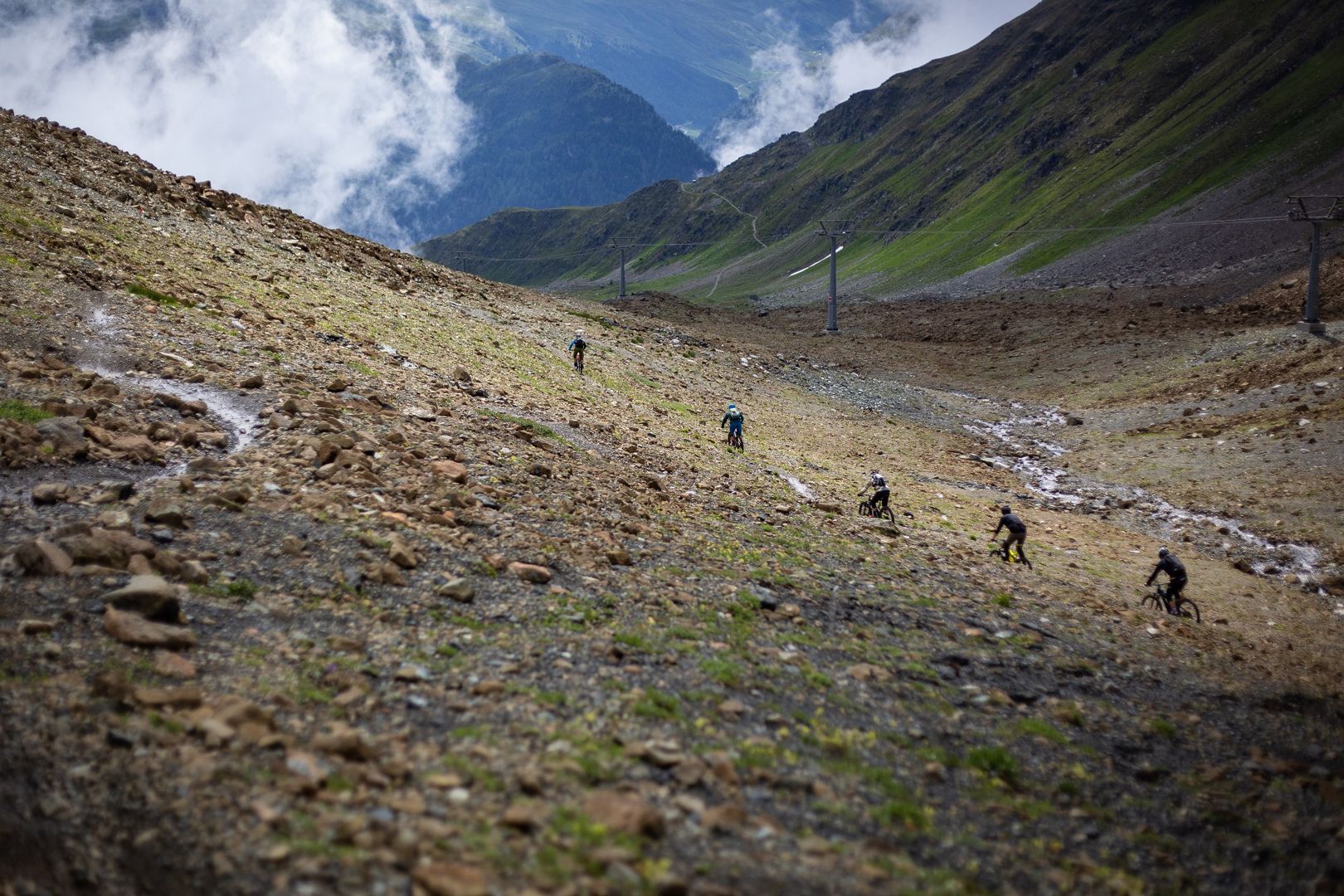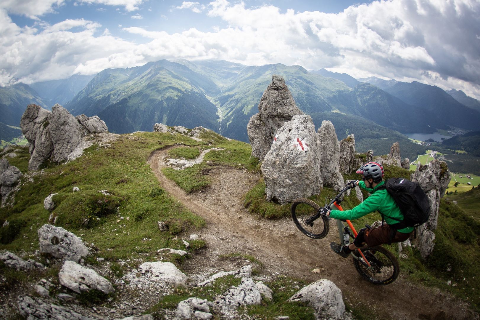 Mijn hart in elk geval wel, als we op onze tweede dag van een lang weekend in Davos in de gondel naar de Weissfluhgipfel (2.844m) onderweg zijn. Het kan ook aan de hoogte liggen, maar onder de kabelbaan ligt een immense rockgarden op ons te wachten. Of eigenlijk is deze hele bergtop één grote, steile rots. Als we niet wisten dat hier paden liepen, zouden we het waarschijnlijk niet eens in ons hoofd halen om hier te gaan rijden.