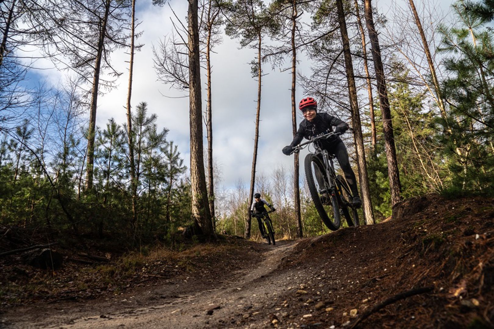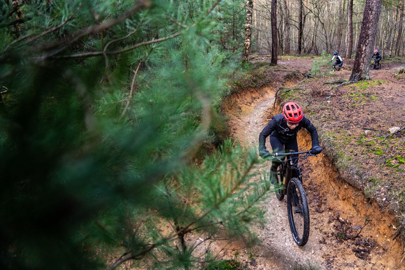 Variatie staat op het menu met pittige klimmetjes en spectaculaire afdalingen. Het zweet komt los, vooral bij de befaamde Sanatoriumklim. Het zandpad kent een rustige aanloop, maar zodra we het bos in duiken, wordt het serieus. Staand op de pedalen komen we bij een driesprong: links, rechts of door het midden. Geen van de keuzes blijkt de makkelijkste weg. Even op adem komen en dan duiken we de lange afdaling in met kombochten door een veld van lage naaldbomen. De route slingert verder door de bossen.