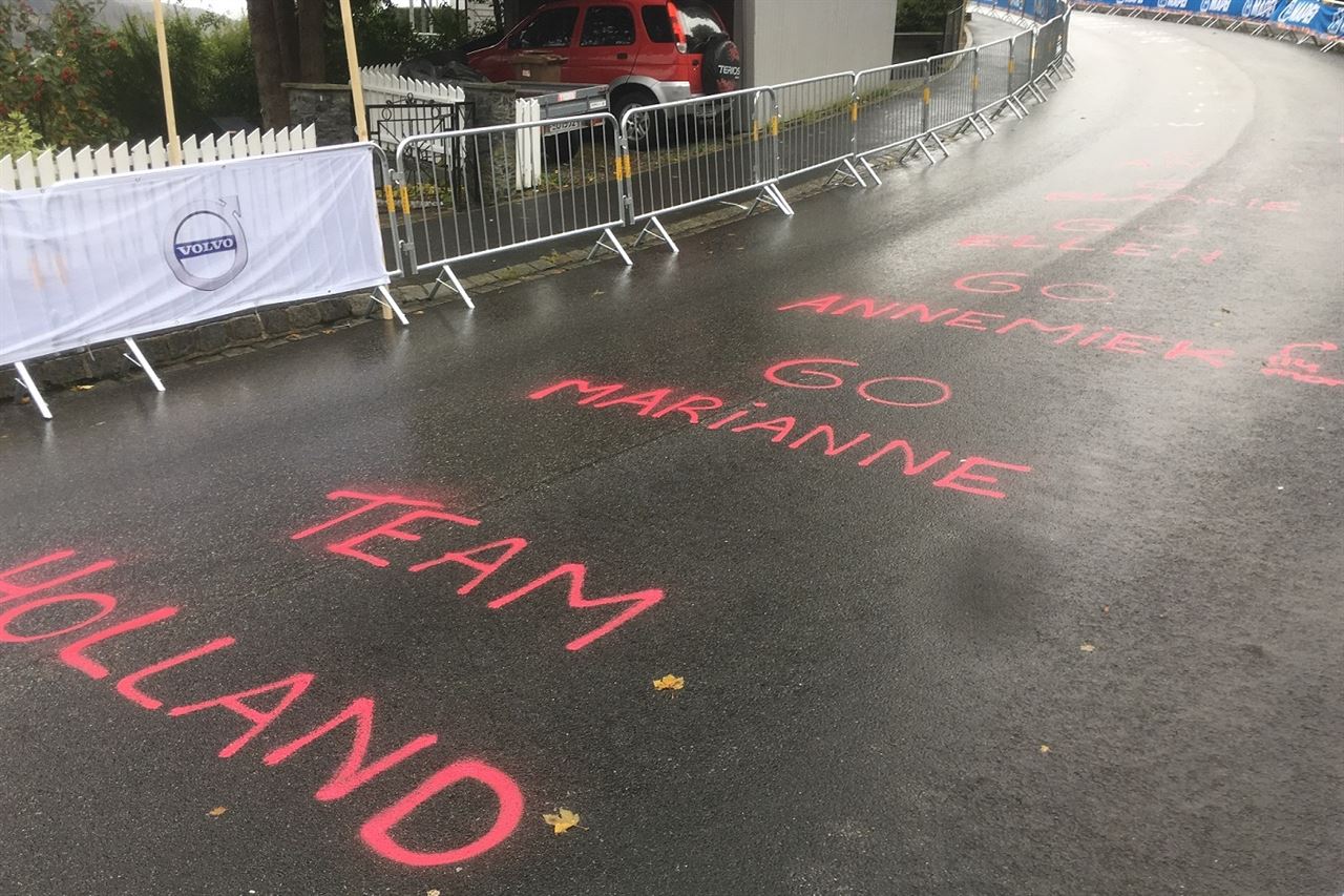 Richting top zijn de Nederlanders overigens al langs geweest. De namen van de dames staan in wit, rood en oranje geschilderd: Van Annemiek van Vleuten tot Chantal Blaak. Ook die van belofte Bram Welten staat ertussen. Ook geregeld 'Eddie' - lokale held Boasson Hagen. Aan de oranje boog - toeval? - die de top markeert hangt alvast een Nederlandse vlag! Het uitzicht over de stad is er prachtig, zeker als de zon schijnt. De afdaling begint met een stukje vlak en dan 300 meter rechtdoor. Niet te steil, maar je kan er al wel stevig tempo pakken. Bij regen - en die kans is relatief, want Bergen is de stad in Europa waar de meeste regen neerdwarrelt - kan dat wel eens gevaarlijk zijn.