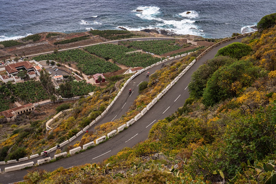 Dan is daar de deze dagen gehypte Masca-klim. Bijna vier kilometer met een gemiddelde stijging van 11,2 procent. Zoals dat meestal gaat met hypes, zo gaat het hier niet. De klim doorstaat de hype. Een bochtig gedrapeerde weg omhoog, tussen cactussen, palmbomen en aloë vera. Met zicht op het dorpje Masca, dat daar al eeuwen ligt op een bergrug tussen puntige rotsen, en de contrasterende oceaan erachter. Afleiding genoeg voor het brute stijgingspercentage.