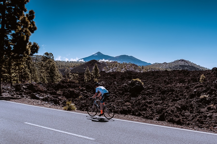 Er wordt getrapt en gehijgd alsof niet de start maar de finish dichtbij is. Misschien is het omdat de naamgever van dit evenement nog niet zichtbaar is, en daarmee nog even niet lijkt te bestaan. Maar met de eerste warme stralen plaatst de zon een spotlight op El Teide. De dreiging is imposant. Een ellelange klim van veertig kilometer wacht geduldig tot deze rit rond de helft is gekomen. Godzijdank is deze vulkaan in de afgelopen miljoenen jaren dikwijls een stuk top verloren door instorting (ooit lag de top zo’n 6.000 meter boven zeeniveau), anders was deze rit niet te overzien geweest.