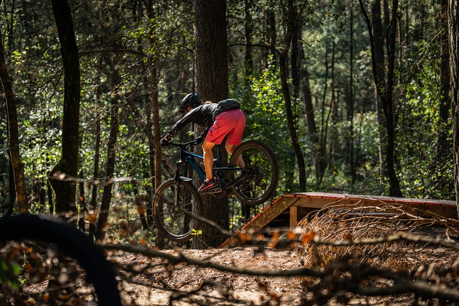 Leonard somt nog een paar technical trail features die de route rijk is. Zo is er een ‘rock garden’, ‘skinnie’, een houten vlonder met drop, een heuse ‘elephant back’ en een serie boomstammen die als een soort panfluit in de grond steken. Hij is blij met het kleurensysteem van wielersportbond NTFU. “Hierdoor weet je als biker op een route kunt verwachten.”