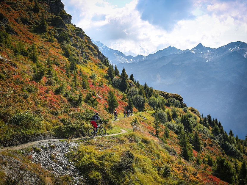 Na een lunchpauze bij de meertjes, met uitzicht op de zojuist afgevinkte zigzag, vervolgen we onze weg richting het plaatsje La Tzoumaz. De kale rotspaden maken vanaf hier plaats voor singletrails door de typische kleurrijke begroeiing die je hier in het najaar veel ziet. Minder exposed, maar nog steeds uitdagend en vooral lekker knallen.