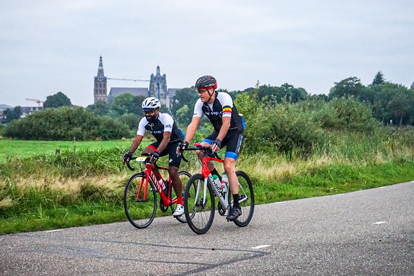 Deelnemers Naren Vinjamuri en Paul Troost hebben na de pauze moeite om het tempo te volgen. We besluiten met zijn drieën verder te fietsen, gevolgd door Fré van Cyclon die ons ondersteunt als bezemwagen. Tijdens Road to Paris fiets je nooit alleen! Gelukkig komen ze al gauw in een flow, geholpen door de rugwind, wat kopwerk en hier en daar een duwtje. Het gat met de groep voor ons zal nooit heel groot worden.