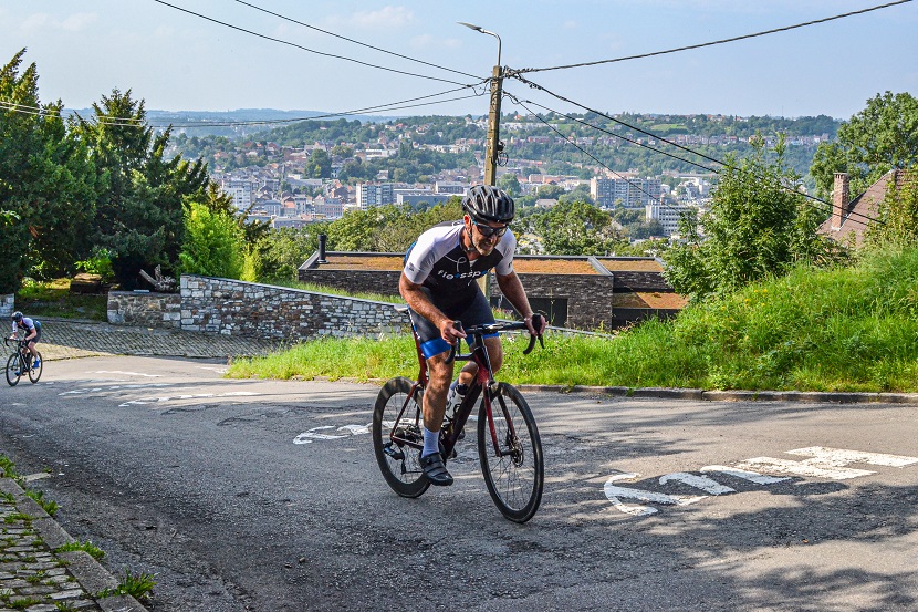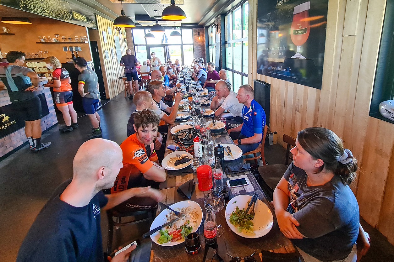 In de finale fietsen we langs de rotsachtige boorden van de Maas, met als hoogtepunt de Rocher Bayard die als een enorme menhir waakt over de vallei. Als de zon begint te zakken, heeft een aantal deelnemers het moeilijk. Wegkapitein Gerard Top laat zich afzakken om ze te begeleiden naar de finish. Het tekent de saamhorigheid die al op dag één van ons fietsavontuur wordt gesmeed. Bij de prijsuitreiking in hotel Castel de Pont-à-Lesse krijgt Gerard het rode stuurbordje voor ‘meest strijdlustige renner’ uitgereikt. Teamspirit wordt beloond!