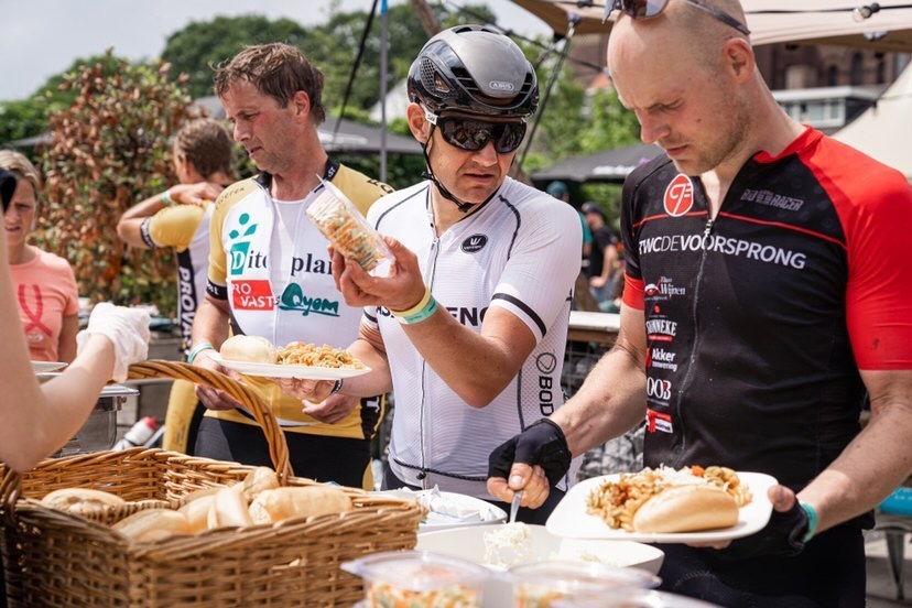 Hoe vaak gebeurt het niet dat je lichaam piept en kraakt, omdat je te weinig gedronken hebt of omdat je een lunch oversloeg? Dat risico was wel heel klein tijdens de Langste Dag Challenge. Op de diverse pauzeplekken was een overvloed aan sportvoeding- en drinken aanwezig. Sterker nog, wij vragen ons af of de afstand misschien niet te kort was om de aangekomen calorieën weer te verbranden. Ook na de finish stonden een heerlijke maaltijd en dito biertje(s) voor de afgepeigerde koppies klaar.