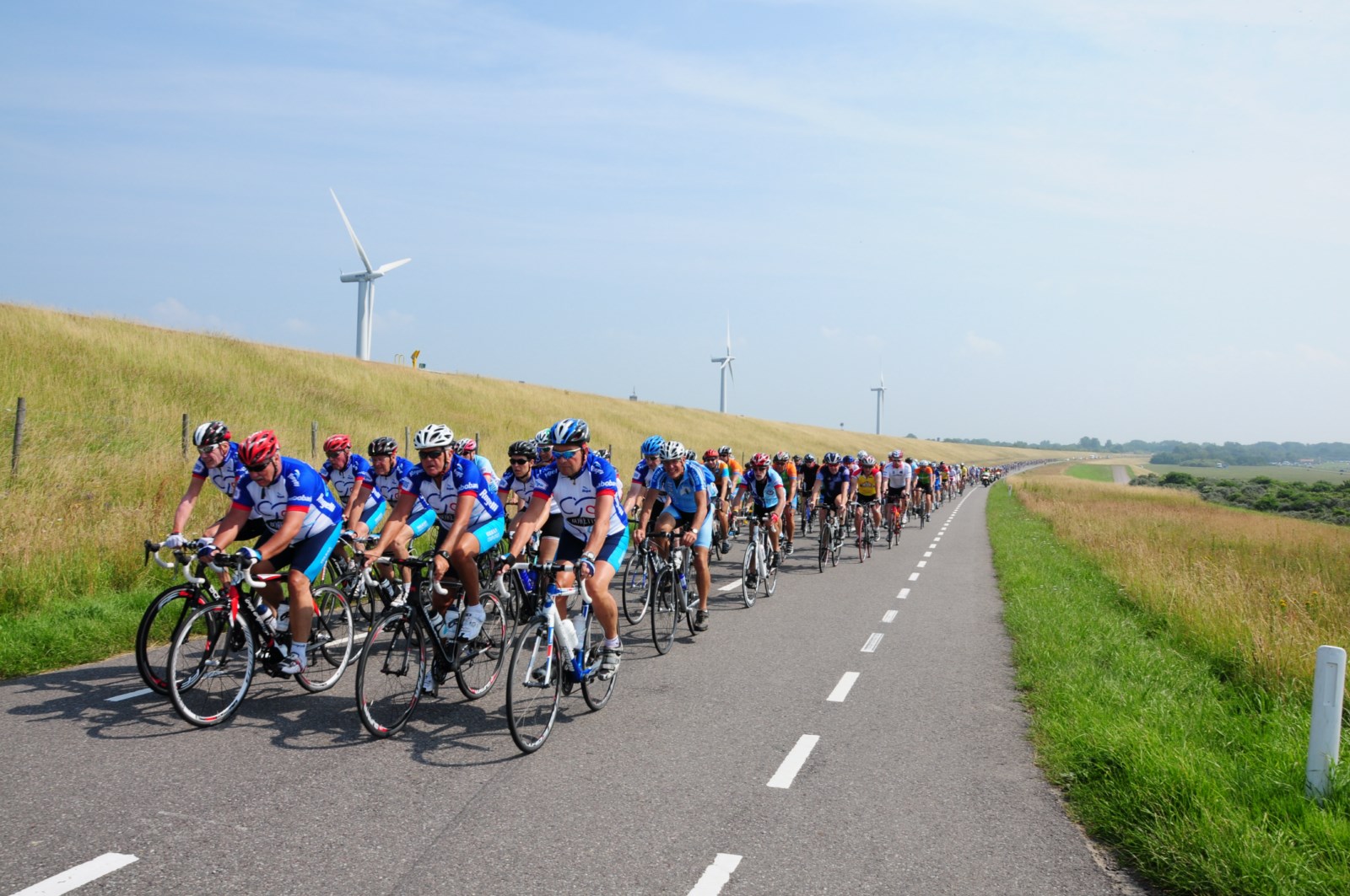 Tijdens de Peloton Ride kruip je in de huid van een profrenner. Het peloton waarin je fietst wordt begeleid door zo’n 45 motoren en 5 motorrijders van de politie. De gemiddelde snelheid is 28 km/uur.