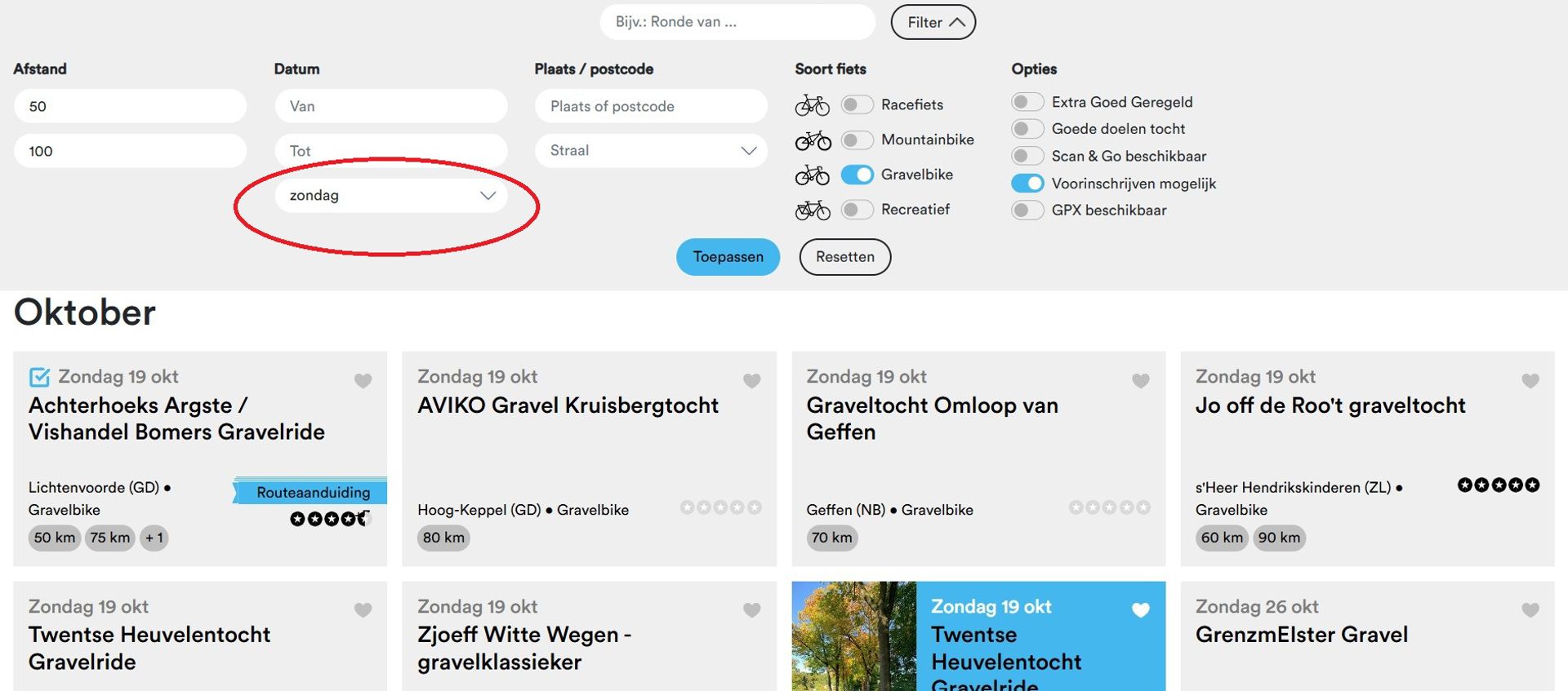 Dan is het wel zo handig dat je kunt filteren op dag van de week. En precies dat hebben we nu geregeld. Jij kiest de dag, wij laten zien welke tochten er zijn. Scheelt je zoeken. En je weet meteen wanneer je je agenda moet blokken. Handig toch?