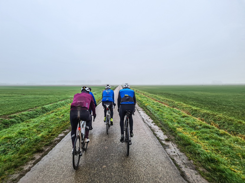 Fiets je in een groep dan is het extra opletten. Rijd een constante snelheid en maak geen onvoorspelbare bewegingen. Dus niet plotseling remmen, uitwijken of van richting veranderen. Zeker op natte, gladde wegen is een valpartij zo gebeurd. Rijd daarom behoudend en pas je snelheid aan waar nodig.